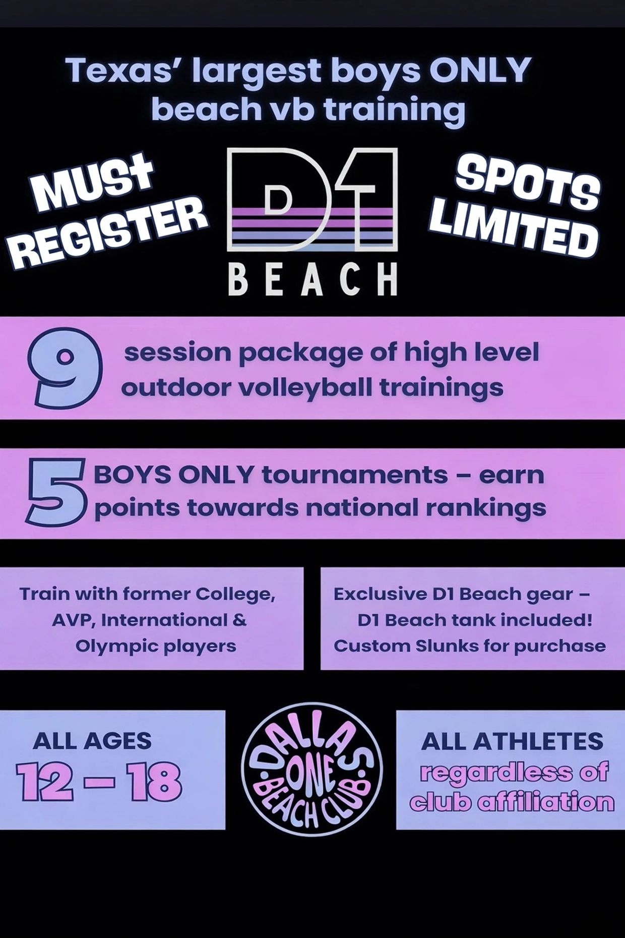 We are looking to fill multiple spots on a 12-14s team and one or two spots on a 16s and 18s team. These teams will compete for Dallas One in Orlando this summer at the AAU Boys National Championships.